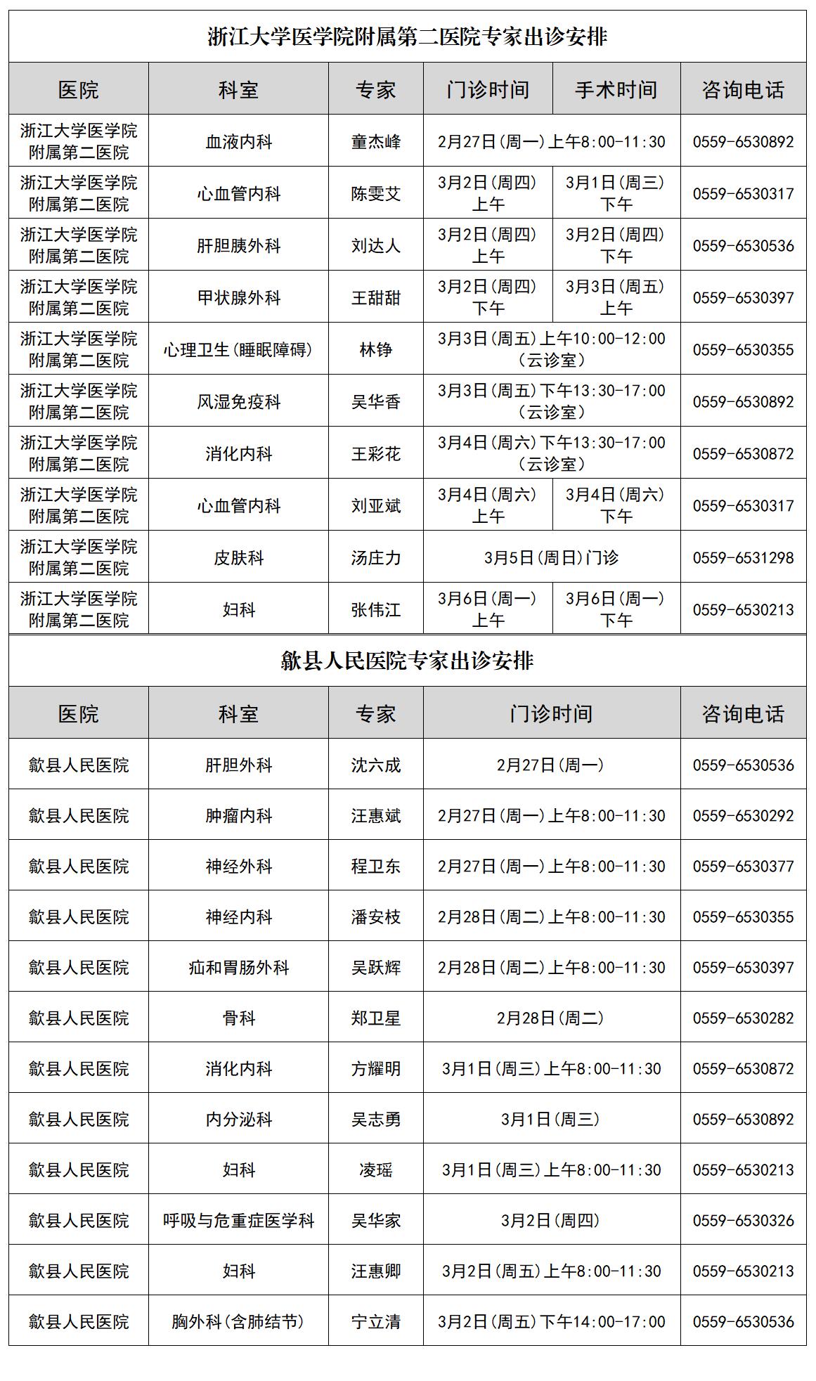歙医医讯 | 浙大二院歙县分院专家出诊安排(2023年3月第一周)